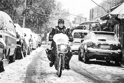 王笑波清楚地记得,那是在2015年11月20日,天气预报明后两天大雪。21日他等了一天,暴雪迟迟未来,到了凌晨1点多,鹅毛大雪如期而至。22日是个礼拜天,王笑波没有提前告知姚平,而是一大早在设计好的胡同口拦截姚平。此时路上并没有多少行人,只有白茫茫的汽车在缓慢前行,突然一阵白毛风吹过,大片雪花伴随着冷风一下子吹透了他的身体,正当他冷得跺脚时,迎面姚平骑车缓缓而来,车前有一白色的塑料袋罩在当日的报纸上,身后两大包绿色帆布邮包搭在自行车的两端,姚平身上已经沾染了一层白色的雪花,头发早已被雪花覆盖湿漉漉的,刺骨的寒风打在姚平的脸上,眼睛有些睁不开,只能眯着眼睛逆风而行。看到此情此景,王笑波立即扔下手中的雨伞,正对姚平单膝跪地“咔咔”连拍数张,然后又跟在姚平身后,在胡同里穿梭拍摄,直到姚平把一份份邮件和报纸送到用户手里。