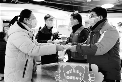 冬至来临之际,崇文门外街道总工会为辖区的新就业形态劳动者准备了“爱心水饺”。职工凭地区“党心E家”卡扫码,即可免费获得一份“爱心水饺”。图为街道工会干部把水饺送到职工的手中。万玉藻 摄影报道