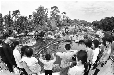 地下建厂、地上建园,污水处理厂变身市民后花园、城市风景线,走出一条城市环保、城市景观和城市更新等多功能融合的新型水生态基础设施创新之路。图为预约参观的市民在广州沥滘净水厂一处出水口参观。