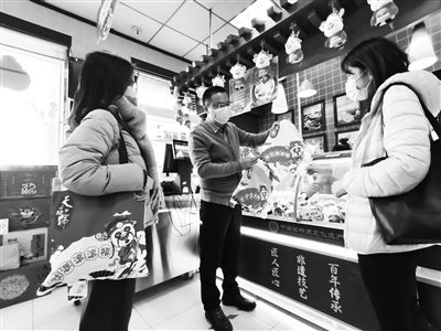 12月26日是中华老字号天福号创建283年周年,天福号全新IP形象“猪小福”和多款全新礼盒首次亮相。据天福号总经理介绍,今年以来,天福号集团联手多家高校签署长期战略合作,开设天福号品牌设计工作坊,以驱动地道京味儿品牌发展为目标,打造“新生代,新面貌,新食尚”的三新体系。图为天福号总经理将印有“猪小福”的帆布包送给消费者。