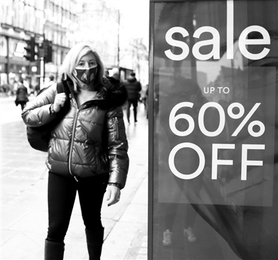 12月26日,一名女子经过英国伦敦牛津街上的一家打折商店。当日,英国年末打折季开始。 新华社发