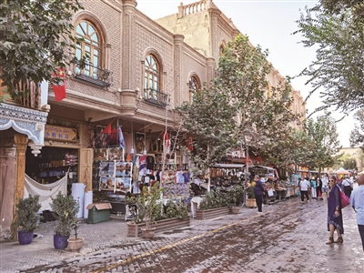 一进老街,就有一种欧风伊(斯兰)韵扑面。两旁的建筑有一种初春柳芽的鹅黄或翠绿,加之家家户外绿植爬上墙头,就如画作“绿上着绿”。通向大街的巷口,大都有一个尖形拱券。巷内,间或黄泥抹墙。建筑的窗户也大都法券,门脸、挑檐、廊柱、墙角上的雕花纹饰精细华美,浓郁的民族风情、灿烂的历史文化在这砖木间烁烁生辉。看起来,一点也没有我想象中高昌古城那般生土城模样。原来,这座“活着的千年古城”,经过了5年“修旧如旧”“一户一设计”以及“统建主体,自主装修”“一路一巴扎”的保护综合治理,这让我这个建筑业“半瓶子醋”,打心里赞叹喀什老城“华丽转身”的改造艺术。