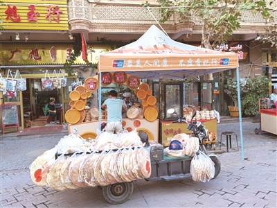 满街美食大都一个“烤”字:烤串儿、烤全羊、烤鸡鸭、烤鸡蛋、烤包子,烤烤烤。最多的,还是金灿灿、香喷喷的烤馕。“馕”源于波斯语,中原称“胡饼”“炉饼”,据说是从中西亚传入的,有两千多年历史,现已发展到20多个品种。如同陕西关中人“一日不吃面,等于没吃饭”,对于维吾尔族人来讲,“可以一日无菜,不可一日无馕”。在新疆吃馕,与北京吃的馕大不一样,新疆的馕外酥而内香。这次南疆游,团友们都爱上了吃馕,也懂得了正宗的馕都是馕坑里烤出来的,否则只能叫“饼”。做馕也不叫做馕,叫打馕,有打馕一条街。