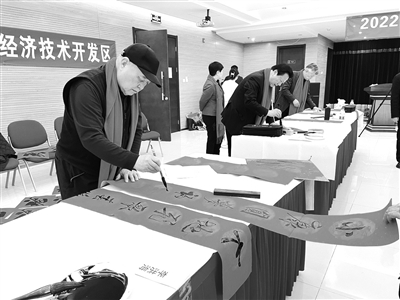 据悉,经开区总工会结合经开区新业态行业、重点企业、抗疫突出贡献单位、冬奥志愿者站点及特困群体慰问情况,邀请中国楹联学会的书法家书写春联。同时根据企业实际情况,即兴进行内容定制创作,向区内企业职工送去节日祝福。