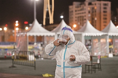 1月10日,传统腊八节,天津市滨海新区泰达第一体育场核酸检测点,工作人员在工作间隙品尝腊八粥。