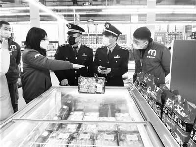 新春佳节即将来临,近日,朝阳区市场监管局对辖区流通领域经营主体开展专项检查,重点检查区内现有的1845家进口冷链食品经营单位。图为在大洋路市场,执法人员对水果厅、禽蛋厅、肉类大厅进行检查,重点对商品明码标价、经营者进货票据、防疫相关措施等进行了询问。