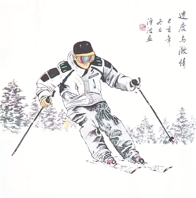 于是,于净波先勾勒出冬奥作品《激情与速度》的草图,将冰雪作为衬托背景,身着参赛服装的运动员立于纸面,驰速前行,一幅标准的动态写意图。这幅作品无论构思还是线条都完全合格,算得上是一幅不错的冬奥美术作品。但于净波却不满意。他用艺术的规范反复打磨,一遍遍修正草图中的“硬伤”,直到每个细节完美呈现,才最后定稿,一幅作品前后用时近两年时间。虽然创作过程漫长,但是于净波却乐在其中。展示北京冬奥文化的系列作品《激情与速度》创作完成后,先后参加了多次主题展览,受到人们的广泛好评。