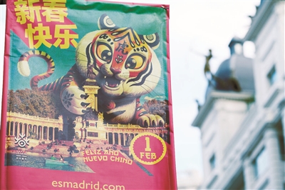 西班牙马德里市政府每年都会邀请艺术家设计一款生肖海报,用以装饰街道,迎接中国春节。图为1月25日在西班牙马德里市中心拍摄的中国春节生肖海报与贺年标语。 新华社发