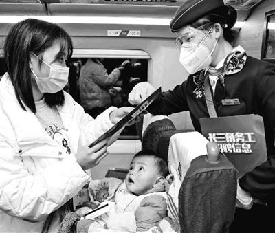 针对长三角地区节后务工流特点,2月12日,铁路上海客运段在G1334次列车上开展就业服务“春风行动”,将招聘信息发放给乘车的返程务工人员,帮助他们提前了解用工信息。(2月14日《新华每日电讯》)