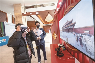 戴上VR眼镜游故宫、爬长城,实景注入,科技赋能,让记者身在新闻中心也能零距离游览北京各大古迹名胜。单车骑行,“悦游”北京,在双奥之城·悦游专区,骑上电子单车,既能放松身心,还能在电子屏幕上阅遍首都风光。媒体工作区的利亚德8K高清大屏,更是呈现了前所未有的视觉体验,为冬奥赛事、直播访谈、风景纪实等节目赋予了更多动感。