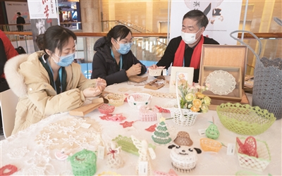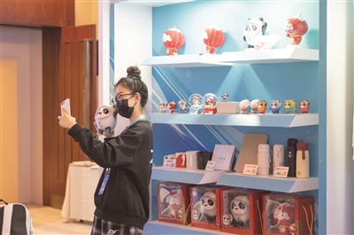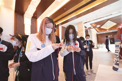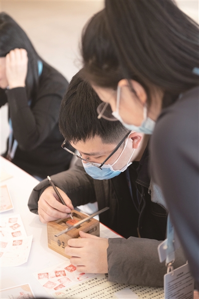 2月12日,新闻中心2层的文化展示区热闹非凡,工作人员、媒体人、志愿者欢聚一堂,坐在一起习茶道、做剪纸、刻印章,在亲自动手实践中上了一次非遗文化课。剪纸的形状五花八门,茶艺桌前谈笑风生,有些人还把自己的印章刻上了“冰墩墩”的图案,过一把拥有“冰墩墩”的瘾。