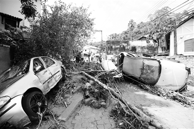 巴西里约热内卢州消防部门2月16日说,位于该州内陆山区的彼得罗波利斯市15日骤降暴雨引发多起山体滑坡,多条道路被暴涨的河水淹没,造成的死亡人数目前已升至78人。图为在巴西里约热内卢州彼得罗波利斯市,倒下的树木和受损的汽车堵塞道路。 新华社发