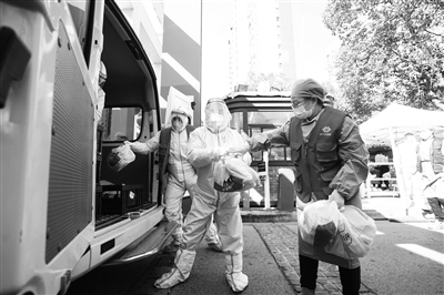2月20日,在苏州工业园区锦溪北社区锦溪苑小区门口,志愿者在交接“蔬菜生鲜包”。疫情发生以来,江苏苏州工业园区为管控小区居民提供生活必需品保供配送服务,动员多家大型商超为封控楼栋居民提供“蔬菜生鲜包”,满足居民生活所需。 新华社发