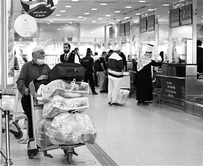 科威特自2月20日起放宽疫情管控措施,其中包括完全接种疫苗人士抵达科威特前后都无需核酸检测及隔离;未接种疫苗人士仍需提供航班出发前72小时核酸检测阴性证明,抵达科威特后需隔离;电影院、剧院、商场等场所恢复开放等。图为科威特费尔瓦尼耶省的科威特国际机场出发大厅,旅客办理登机手续。