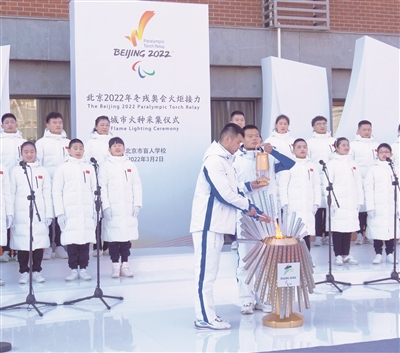 互助之火——采集自望京街道温馨家园。由健全采火人固定轮椅,肢残采火人用投壶推杆推动冰壶撞击采火器引燃火种。互助之火意在为残疾人带来如家般的温暖和力量,帮助残疾人群体自立自强,展现人生价值。