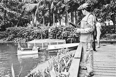 3月3日,环卫工人操控无人驾驶清洁船在海南省海口东湖清理湖面。今年1月,一艘无人驾驶清洁船在海口东湖投入使用。该船运载量约50公斤,可清理湖面上的树叶、水草、塑料水瓶等垃圾。(3月4日《工人日报》)
