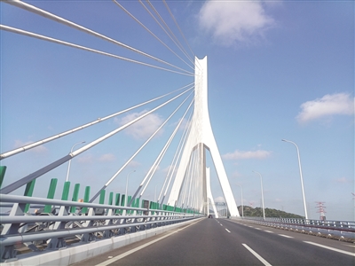 将车速控制在这一路段的最低限速,以便在缓缓而行中,观赏着这条巨龙在海上与海岛间逐渐延伸。只见那一根根粗大的桥墩,就像传说中的定海神针一般插入海底。当车子驶到那高大斜拉悬索构成的网状桥段时,给人一种强烈的动感。