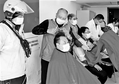 近日,东城区市场监督管理局志愿服务活动在北新桥街道举行。金板寸理发店和兄弟帮扶中心的职工志愿者现场为快递、外卖、环卫等行业新就业形态劳动者提供理发、保健按摩等服务。万玉藻 摄影报道