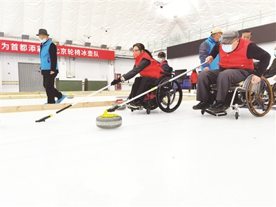 3月11日,“我和冬奥有个约会”冰壶体验日活动在北京市残疾人文化体育服务中心气膜式冰壶冰球运动馆举行,来自东城区残联的残疾人旱地冰壶队在真冰上进行了训练。