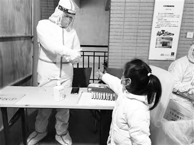 根据社区楼号顺序下楼后,我发现,“大白”们已经准备好了。他们穿着厚厚的防护服,检测时指导人们张大嘴巴,棉签在喉咙处来回擦拭。“好,下一个。”“大白”那沉稳、耐心的语气,让情绪紧张的人们瞬间放松了下来。