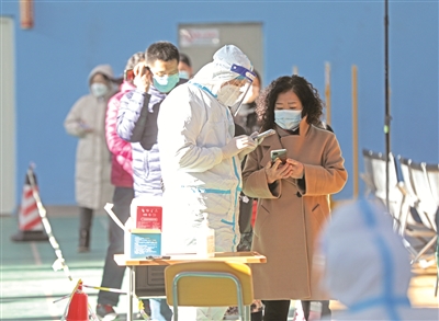 为抗击本轮疫情,辽宁省沈阳市3月19日和20日城市公交、地铁、有轨电车临时停运,商业综合体等商业服务设施暂停营业,全体市民进行第二轮核酸检测。图为沈阳市和平区126中学长白岛校区核酸检测点,工作人员为市民录入登记信息。 新华社发