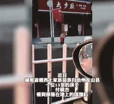近日,湖南省湘西土家族苗族自治州龙山县一位13岁孩子付淑杰,像往常一样去上学。当她步行至县城岳麓大道时,看到一面五星红旗掉落在满是泥泞的地上,她连忙把国旗从地上捡起,认真叠好后放在路灯杆上。