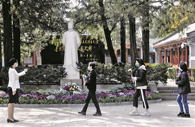 临近清明节,人们纷纷前往万安公墓李大钊烈士陵园开展清明祭奠活动,深切缅怀伟大的革命先驱李大钊同志的丰功伟绩。图为来自中国科学院国际合作局的党员向李大钊同志纪念像敬献鲜花。