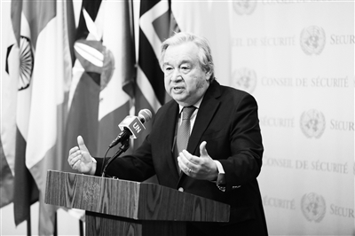 图为3月28日,在位于纽约的联合国总部,联合国秘书长古特雷斯在记者见面会上讲话。