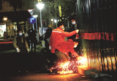 3月31日0时起,解封地区的围挡被陆续拆除,沿街居民楼和商铺逐渐重新出现在人们的视线当中,空气中弥漫着浓郁的消毒液味道。街道工作人员、消杀人员、安保人员等仍然在现场忙碌着。“拆除下来的围挡还要进行一次全面消杀,才能运走。”一位工作人员说。
