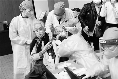 94岁的高铦老人经过30分钟健康监测,完成了疫苗接种。高铦是1928年生人,曾任中国社会科学院拉丁美洲研究所译审、学术委员会主任,长期从事拉丁美洲和第三世界经济社会研究教学工作。
