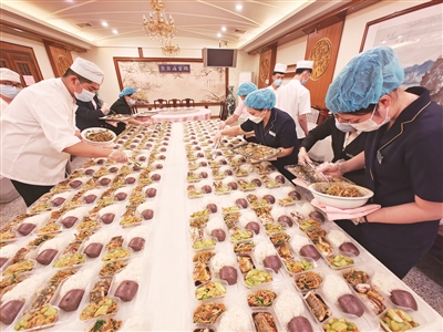 “五一”假期,老字号鸿宾楼担负起为展览路街道和月坛街道社区工作者送餐的工作。连日来,厨师长亲自为社区工作者制定了几十种营养菜肴,每天制作量上百余份,菜品出锅后以最快的速度进行分餐,由该店经理亲自带队,分头将营养餐第一时间派送到各社区,让社区工作者吃上热乎安全的饭菜。本报记者 孙妍 摄影报道