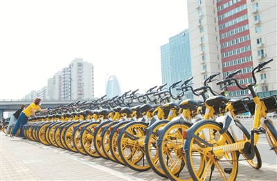 5月18日,在朝阳区呼家楼地铁站外,工作人员在为共享单车消毒。近日,共享单车运营方加强对北京市内共享单车的消毒措施,部分点位的共享单车配备消毒洗手液,以保障市民在疫情期间的骑行安全。