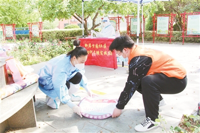 5月23日,在通州玉桥街道6个社区的20余个核酸检测点位,排队居民有序地站在一列醒目多彩的“文明圈”里。“文明圈”中画着核酸采样手绘卡通图、手拿针管与病毒作斗争的白衣“战士”、对个人防护要点的详细科普……居民在排队做核酸之时,都被这些“文明圈”深深吸引。