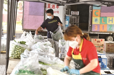 经过4个小时紧张地配菜、打包、装车,早上6点,满载着果蔬的“蔬菜直通车”驶进海淀区学院路街道十五所社区的小广场,为居民们送来了新鲜的蔬菜、水果。