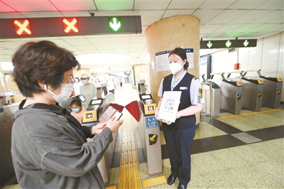 目前,本市在人工核验健康码的115座重点地铁车站开展票务升级乘客体验测试。昨天,在地铁建国门站闸机处,地铁工作人员设置了“票务升级服务台”,帮助遇到困难的乘客解决问题。自6月1日起,用户在线下、线上申办一卡通卡(含实体卡、手机NFC)首次充值时,需持本人有效身份证件或在线提供相关信息办理,加载健康码信息关联功能,无需手动升级。截至5月29日,包括一卡通实体卡、手机NFC、乘车码、民政类卡等,共计办理一卡通升级服务超700万张,目前升级工作有序进行。