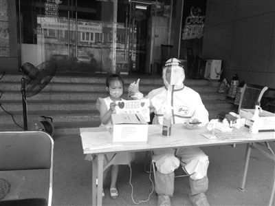 葛梅华的辛勤付出,居民看在眼里,记在心中。检测点附近的17号楼,有一位阿姨每天早晨都来招呼葛梅华和社区工作人员到她家吃早餐,虽然每次都会被大家婉拒,悻悻离开,但阿姨总会竖起大拇指:“你们是最棒的,阿姨给你们点赞!”不仅如此,每天她还挨家挨户提醒居民按时参加核酸检测。一天中午,一位阿姨提来西瓜和苹果,放到葛梅华脚边,说:“你们辛苦了,一点水果,收下吧。”说完,头也不回地走了。“不可以,不可以!我们有纪律,谢谢您的心意!”葛梅华放下手中的活儿,赶紧追上去。阿姨急了:“我不管什么纪律,就是想让你们解解暑!”还有一次,一位名叫李叡萱的小朋友画了幅画赠给葛梅华,说:“大白叔叔,您辛苦了!”尔后,还站在葛梅华身边合了影……