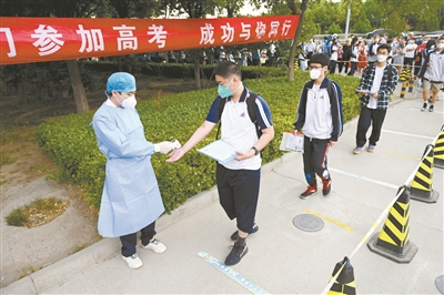 6月7日,高考正式拉开帷幕。据悉,今年北京市共有54728人参加高考报名,除前期高职自主招生录取考生外,参加6月高考考生共48693人。全市18个考区,共设常规考点99个、常规考场1714个、备用考场321个,设置备用考点55个。图为在北京市十二中钱学森学校考点,考生有序排队逐一测温后进入考场。