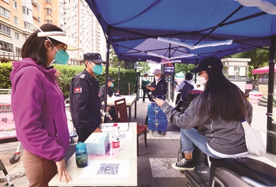 6月16日,丰台区青塔街道抽调街道干部配合社区工作人员包点分片做“守门人”,坚决落实小区出入口管理,持续做好测温、扫码、核酸查验、登记“四件套”。