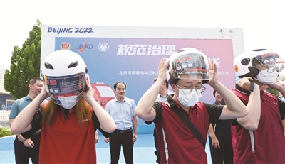 7月20日,北京市快递电动三轮车辆“八统一”规范管理启动仪式在昌平区天通苑文化艺术中心举行。北京市总工会、北京市快递协会和10家快递企业代表,共计80余人参加活动。图为活动现场的快递员正兴奋地试戴新领到的安全头盔。
