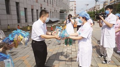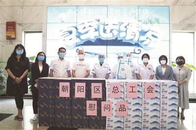 除了关注重点行业的户外劳动者之外,各级工会还特别关注在烈日下坚守抗疫一线的医护职工和志愿者。西城区总工会开展了医护人员专项慰问,为区卫生健康委送上慰问金58万余元,用于全区近8000名医护工作者的慰问活动。朝阳区特别加大了对防疫一线职工的关心关爱,为基层抗疫一线、城市运转一线、保供服务一线的职工发放了“清凉包”、饮用水、洗手液、消毒湿巾、雨伞等防暑降温慰问品。昌平区总工会在“送清凉”活动期间,共投入资金179万元,为奋战在疫情防控一线的工作人员送去慰问。