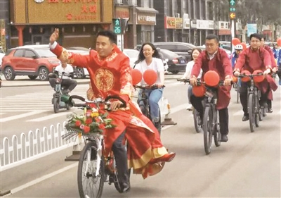 点评:浪漫的一幕让人赞叹不已,自行车迎亲低碳环保又有新意。为这样的迎亲方式点赞!