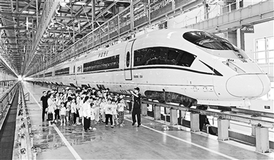 7月27日,在合肥南站动车运用所,20多名务工者子女正在聆听机械师关于动车的先进技术和发展历程的讲解。当日,安徽省合肥市包河区常青街道凌大塘临工集散中心开展务工者子女暑期夏令营活动,组织留守儿童和家长赴合肥南站动车运用所、合肥劳模工匠馆等场所参观学习。(7月29日《工人日报》)