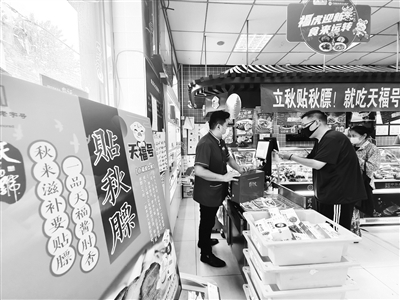 8月7日迎来立秋,北方有立秋贴秋膘习俗。记者昨天在天福号西直门店看到,市民早早来到店里为立秋备选肉食。从7月下旬开始,老字号天福号工厂就开始为立秋准备了充足的王牌产品,近80吨酱肉以及酱牛肉等各类熟食,为消费者提供多样化选择。本报记者 孙妍 摄影报道