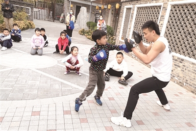 8月10日,一群小学生在石景山区苹果园街道跟着暑期辅导员学搏击。据了解,为了让孩子们过一个快乐的暑期,该街道专门开办了国学课堂,科目包括中国式摔跤、手绘团扇、跳绳小达人、传统绳结编制等具有传统特色的文化活动,让孩子们在娱乐中学习传统文化知识。