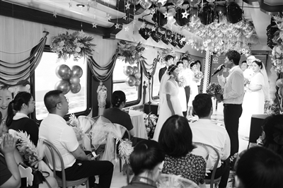 婚礼现场,来自中铁建工西北分公司基层一线的6对新人脱下工装和安全帽,换上白色婚纱及西装,手持私人定制的“幸福号”列车车票,沿着迎宾区,一步步走向月台。“今年参加了好几场婚礼,但是第一次在火车上见证新人的幸福时光。”前来参加集体婚礼的职工张莹说。