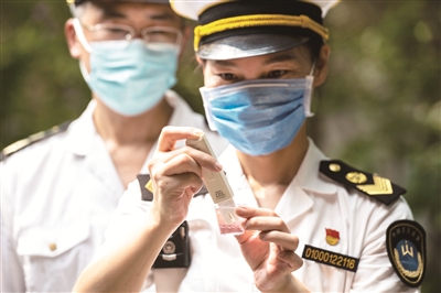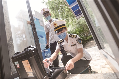 走出“地下”,滕艳霞和秦志如来到小区的地面。此刻,闷热感并没有减退。炙热的太阳“烧烤”着大地,两人戴着制服帽的额头上,汗水不住地淌。简单擦拭后,两人开始对小区的现场制售水机进行检查。滕艳霞从制售水机中接出一杯水,她先观察了生活饮用水的感官状况,随后将快速检测设备伸到水中。很快,相关数值就出现了。这时,她根据数值对比是否符合国家生活饮用水卫生标准。