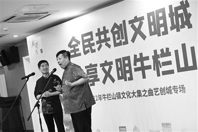 近日,“全民共创文明城 共享文明牛栏山”暨2022年牛栏山镇文化大集之首场曲艺创城专场开集。此次活动由中国煤矿文工团说唱团演员组成的新时代文明实践文化文艺志愿服务队,用相声、快板、评书、故事等形式,将创城知识以及牛栏山镇的特色亮点工作送到百姓身边。