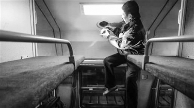 此刻,这辆只有十二节车体的列车像一台摄像机,无声地录制着工作人员的工作状态:联络电台外放的声音此起彼伏,仿佛劳动的号角,在这样的背景音下,工作人员穿梭其中,地勤人员有条不紊地往车厢里摆放卧具、餐具、打扫卫生的工具,列检的师傅们则对车体进行出发前的“望、闻、问、切”,敲击声像夜莺的歌声,飘荡在铁路线上。