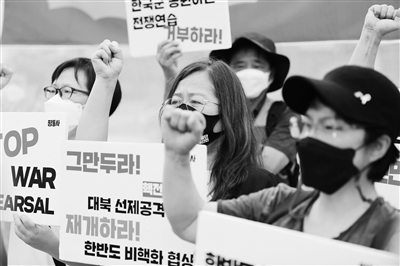 韩国“和平统一开创者”、《6·15共同宣言》韩方实践委员会等多个民间团体当天在战争纪念馆前举行抗议集会,呼吁韩美中断联合军演。