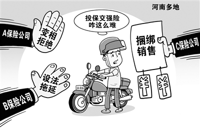 保险公司拒保拖延、捆绑销售,摩托车主来回折腾、苦不堪言……国务院第九次大督查第九督查组在梳理国务院“互联网+督查”平台收集的问题线索后发现,不少河南摩托车主对交强险投保难问题反映强烈。日前,督查组实地走访了河南省郑州市、焦作市等地多家保险机构,发现不少地方以摩托车为代表的高赔付车型的确难买交强险,相当数量摩托车脱保,对群众日常生活和道路交通安全造成影响。(8月25日 新华社)□朱慧卿